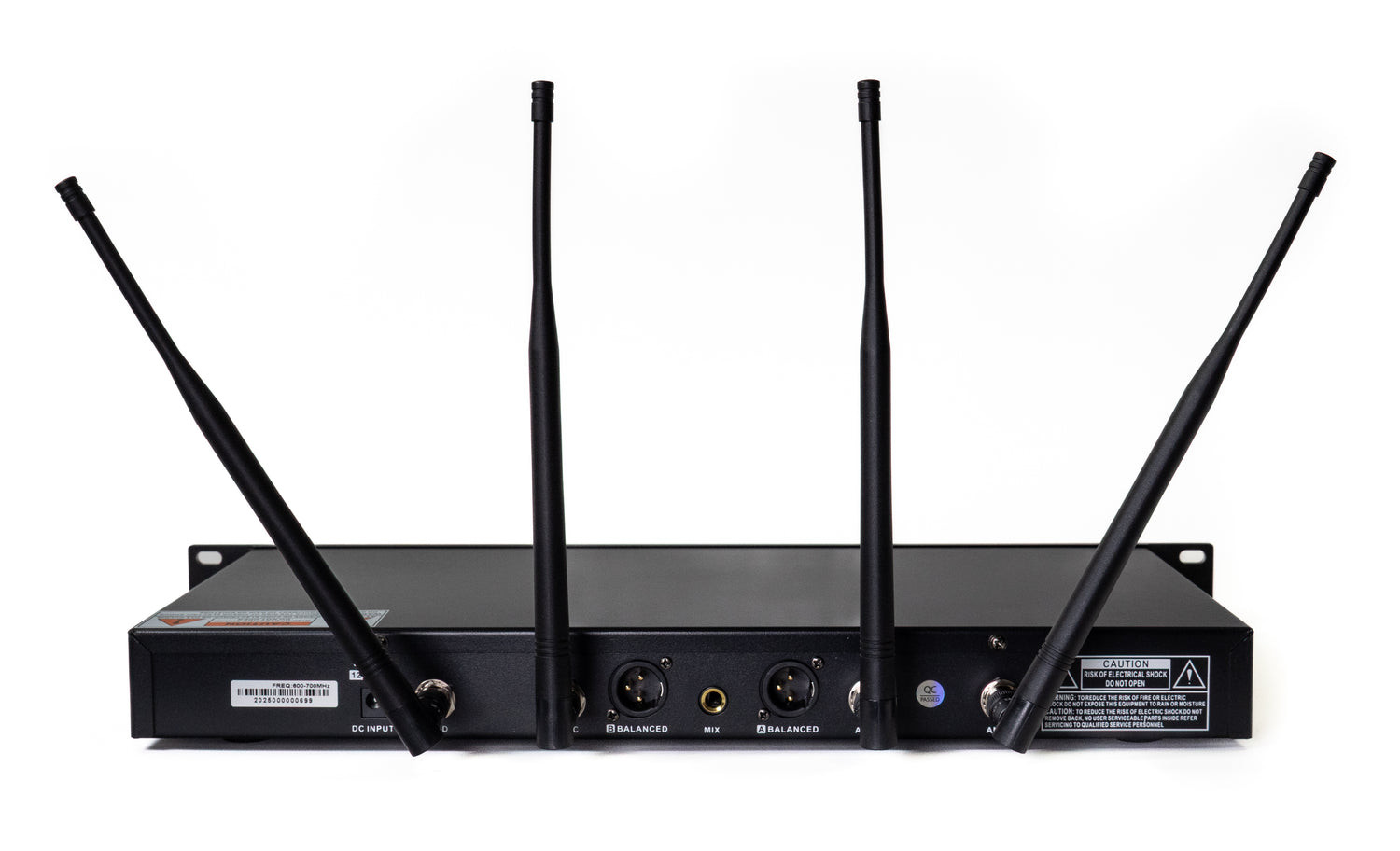 Professional UHF wireless microphone with 200 selectable UHF frequencies, 4 antennas, SMT circuit diversity, IR scanning of frequencies, and a maximum range of up to 200 meters – ideal for stage shows and performances.
