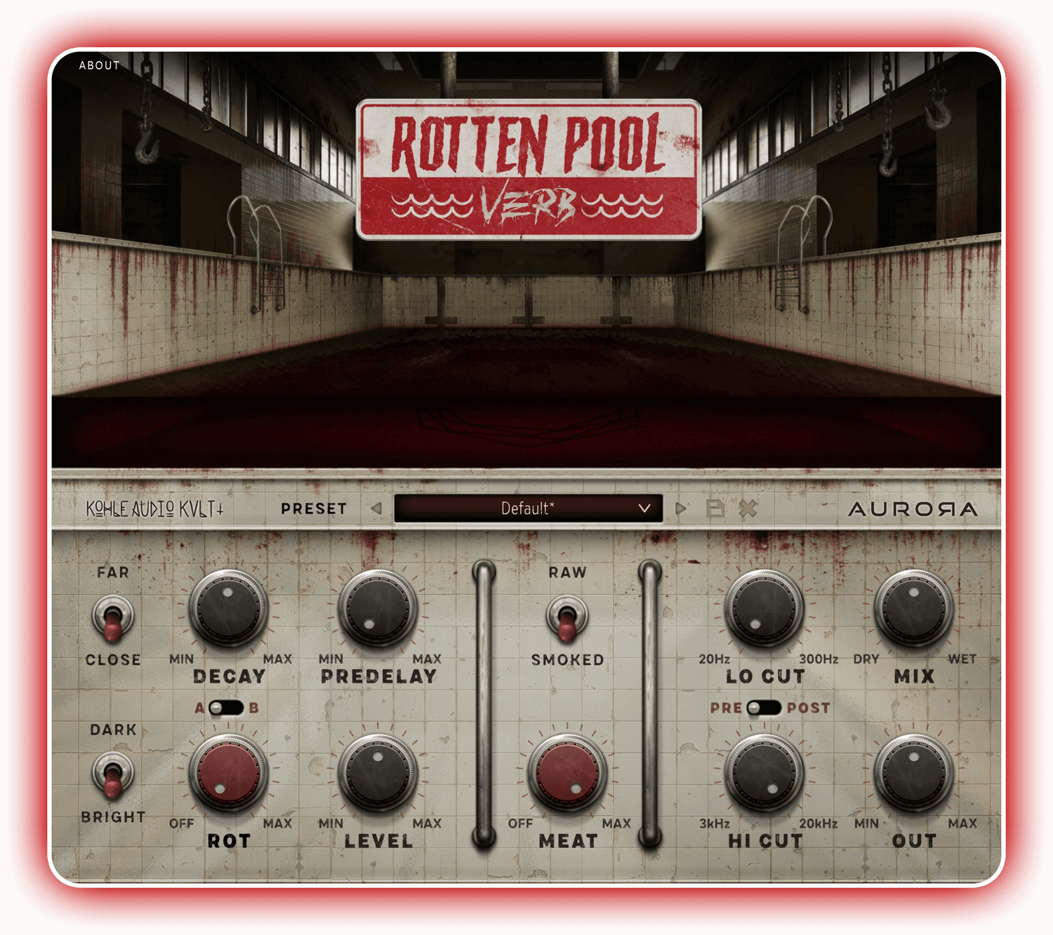 The ROTTEN POOL VERB combines two reverb sections with a filter and a tasty distortion. You can blend the highly diffuse verb of the big pool with a shorter slap verb from the pool’s locker rooms. You can create beautiful, lush spaces with the big verb, you can fatten your drums with the locker room or create the most dirty and scary distorted ambience with one click!