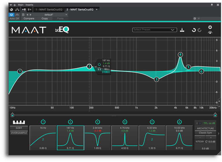 1. All 12 equalizer Architectures are normalized to have exactly the same bell shape for 6dB of boost. If you use just one bell filter at +6dB, you will get the same audible result for all types. This normalization of the Q or Quality Factor is a unique MAAT feature, and distinguishes our typologies from their analog antecedents because many of the originals have undefined Q definitions due to the limitation of analog technology. The normalization allows you to compare the different EQ Architectures in SantaCruzEQ with ease.