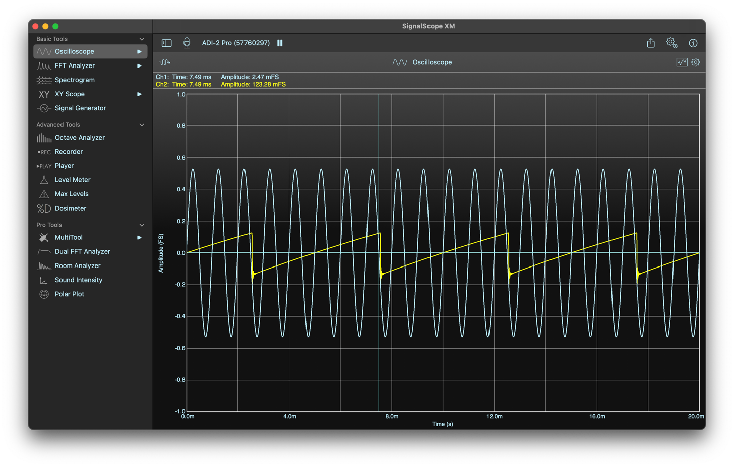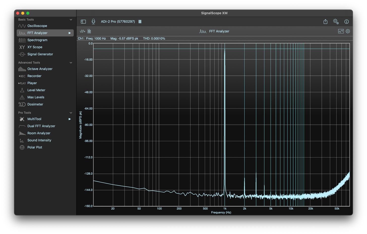 SignalScope XM’s Basic Tool Set includes access to a suite of basic analysis tools, plus specialized hardware support, such as auto-loading factory-supplied microphone sensitivities for select USB microphones, updated nominal voltage sensitivities for select audio input devices, and automatic calibration for audio input devices that include built-in sensitivity information.