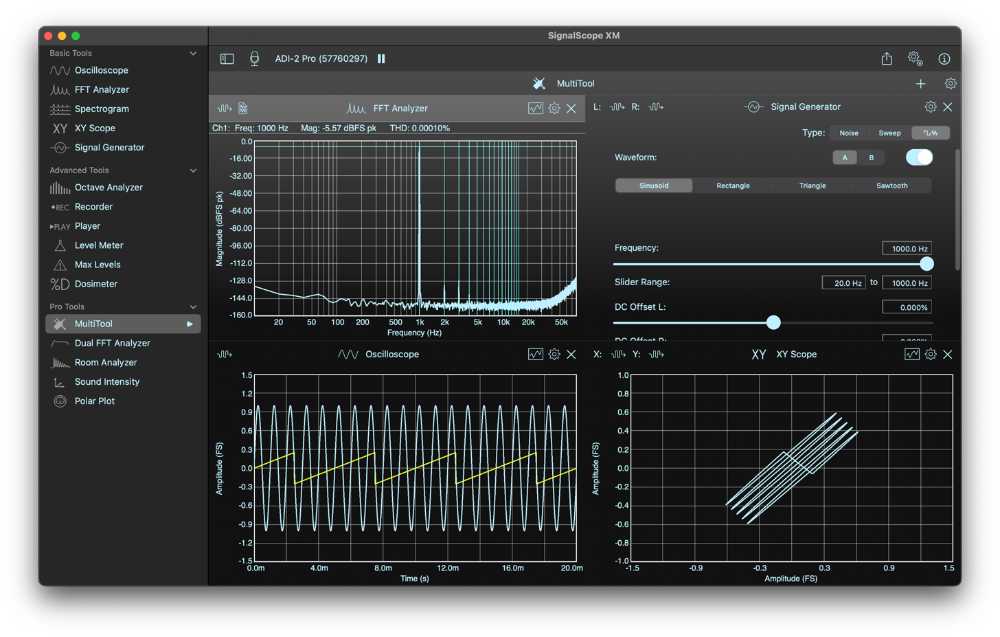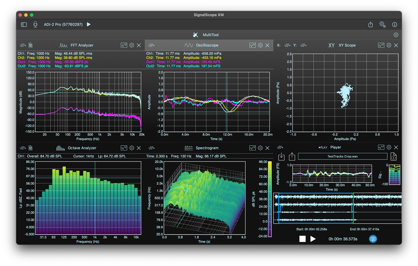 SignalScope XM’s Pro Tool Set includes access to a suite of basic, advanced, and professional analysis and measurement tools, plus a suite of features designed for professional users and specialized hardware support, such as auto-loading factory-supplied microphone sensitivities for select USB microphones, updated nominal voltage sensitivities for select audio input devices, and automatic calibration for audio input devices that include built-in sensitivity information.