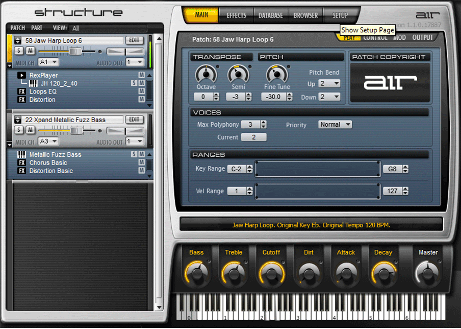 With Structure, you can create complex, rich patches by blending together multiple samples and effects. Each patch can have an unlimited number of parts, and each part can consist of a single sample, multiple samples, a sub-patch, a MIDI processor, and audio and MIDI effects. All of these elements can be rearranged and tweaked for extensive sound experimentation.