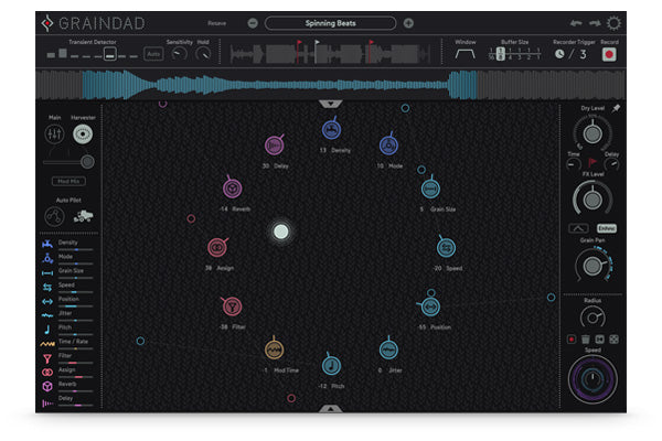 The Harvester modulates all 12 main controls at once. The distance between the Harvester and parameter objects defines the modulation depth. The parameter objects have "moons" that can be recorded as automation or randomized for additional layers of motion. On the Auto-Pilot Page, the Harvester can move between 12 breakpoints, which can also be triggered by MIDI notes for performative control.