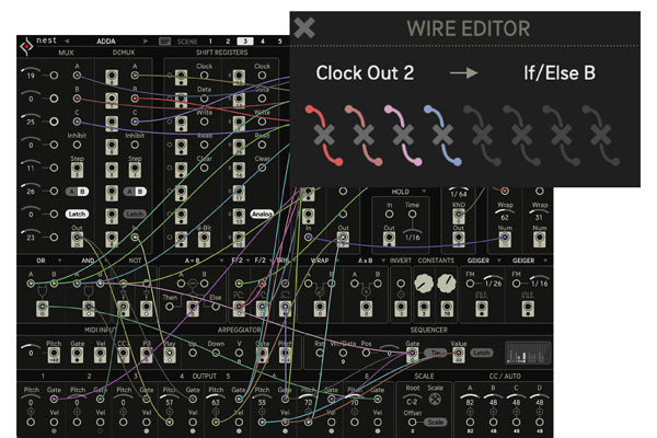 Nest is equipped with resemblings of classical, transistor based integrated circuits like Shift Registers or Multiplexers, plus programming tools like the if/else and math modules. Also a writable Sequencer and flexible Arpeggiator are onboard, to make life easy when needed.