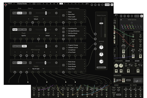Nest is a modular sequencer. It offers all kinds of modules to generate and process triggers and numbers. You can build highly complex sequencing environments with the aim to produce music with a life of its own.