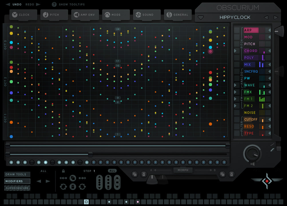 The Super Obscure Mode automatically draws sequences in most various ways. The Modifiers paint all parameters at once: while setting individual steps you can define their sound. Step by step a different sound – this is the agenda here.