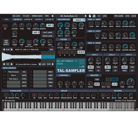 TAL-Sampler is not just a sample player. It's a full featured analog modeled synthesizer with a sampler engine as sound source, including a powerful modulation matrix and high quality self-oscillating filters.
