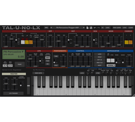 TAL-U-NO-LX is a complete rewritten emulation of the popular Juno 60 with a new engine and GUI. Up to date zero feedback delay filters and carefully calibrated controls make this synth a good replacement for the analog device with all the advantages software plugins have. As an addition, the TAL-U-NO-LX also supports portamento and different filter LFO waveforms and some more useful features. An arpeggiator with different sync modes and hold function is also included. A very fast envelope with a smooth roll-off, emulated inaccuracy and a very smooth filter sound gives this synth the typical sound. The synth was calibrated after a hardware device that's property of TAL.