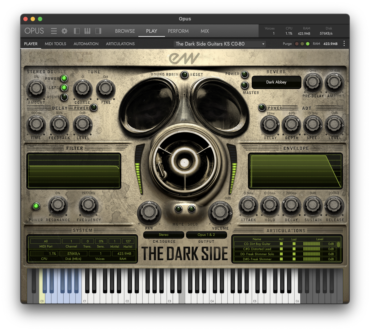 THE DARK SIDE includes a vast, 40 Gigabyte collection, including dark and eerie instruments, and highly processed drums and percussion, basses, guitars, ethnic, keyboard, strings, and effected instruments, all organized into instrumental groups so you can create complete tracks.