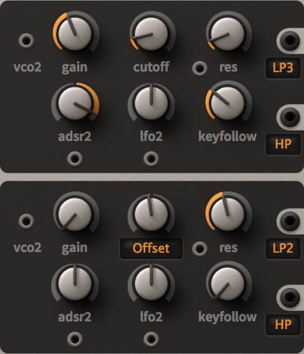 For an extra aggressive sound, route your signal through both filters and crank the resonance on the second filter. Both filters are cascade type multimode circuits with two parallel outputs each.
