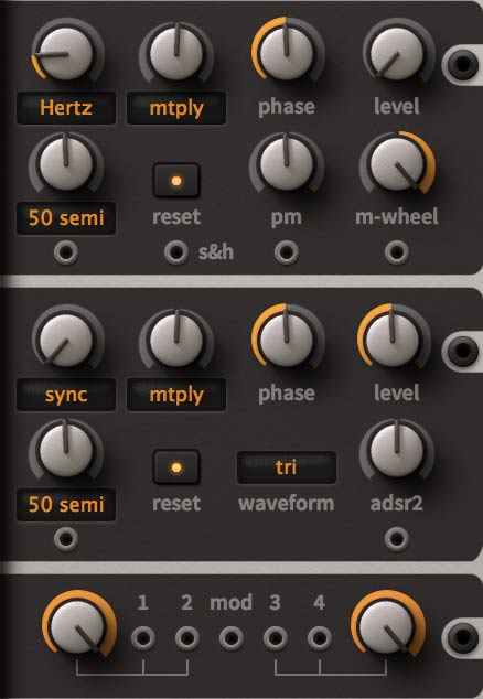 - Oscillators include pulse width modulation (PWM), sync, internal ring and cross modulation (FM)