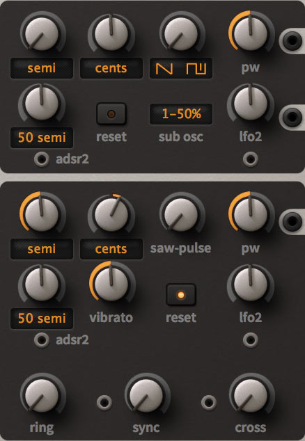 The two VCOs act as the main sound generators, but as ACE does not differentiate between audio and control (modulation) signals, the full-range LFOs can also be used to generate audio frequencies.