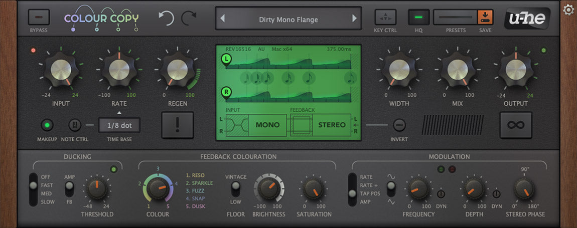 Colour Copy comes with the obligatory ducking compressor, but with a unique twist: You can select whether to duck the entire delay output or just the feedback signal. This latter option leaves the very first delay unaffected, preserving the overall stereo "space" while preventing the sonic mayhem that high regeneration often causes.