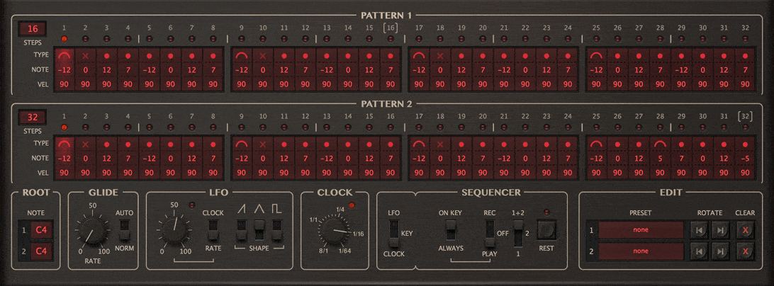 The sequencer in the original hardware may have been a stroke of genius. Repro-1's version lets you step-record two patterns of up to 32 notes each, which are also saved with the preset and support copy/paste of pattern's presets between different instances of the plug-in.