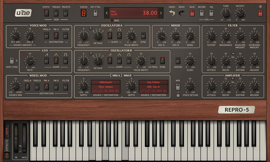 Repro-1 is a fierce monosynth: The classic design gives you immediate access to all the raw power: Two oscillators, self-oscillating 4-pole lowpass filter, arpeggiator, step sequencer, the unique modulation section, and five stomp-box effects which can be arranged in any order. Hard working, raw sounding and immediately playable, it's a simple and intuitive synthesizer which belies a deep feature set capable of a wide range of sounds.