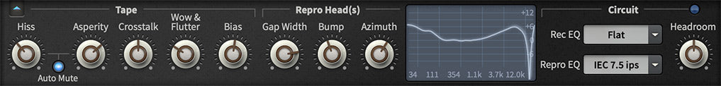 The Repro Head(s) parameters control the physical attributes of the tape heads. With Gap Width and Bump you can cut or boost certain frequencies and introduce resonances and fluctuations. Azimuth pushes the audio off-centre for interesting spatial effects, mimicking a skewed tape head.