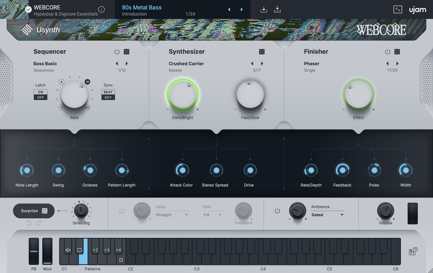 WEBCORE is a playful, glitchy Usynth for chaotic modern genres like Glitch Pop, Hyperpop, Digicore, and Botanica. Its sounds are proudly synthetic — metallic, clean, and digital rather than acoustic or retro. WEBCORE is the perfect stylistic companion to Beatmaker CHROMED.