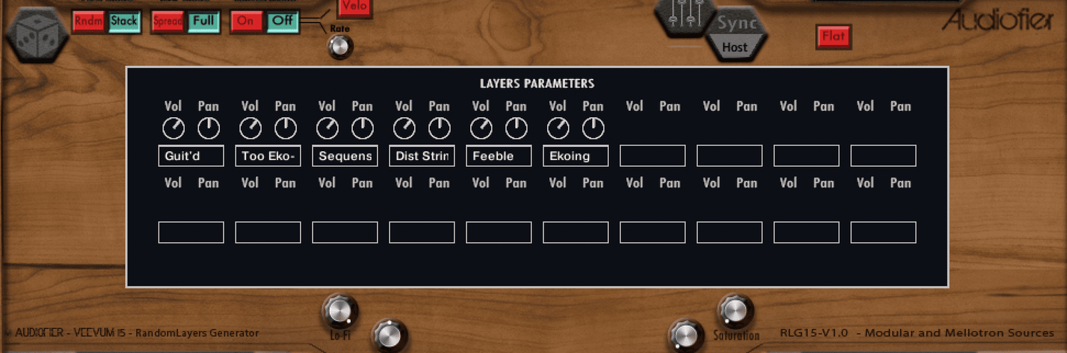 When the sound sources are chosen (up to 20 at once in VEEVUM SYNC MOD-TRON), they can be played in several ways: RANDOM will select a different sound source per played note, STACK will play all sound sources at once (FULL STACK) or will distribute all chosen sound sources in the keyboard (SPREAD STACK). FULL STACK also can crossfade each sound source with individual volume Lfo’s to create evolving textures (STACK CURVE MODE).