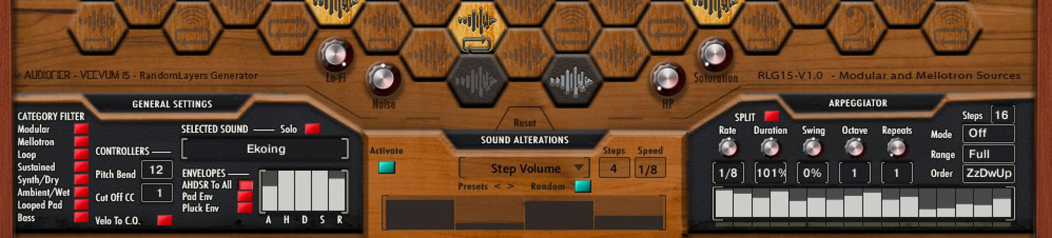 VEEVUM hosts an arpeggiator which in conjunction with the RANDOM playing mode will generate sequences of notes, triggering different sounds every time. Also VEEVUM sports a Step Volume and a Step Filter effects.