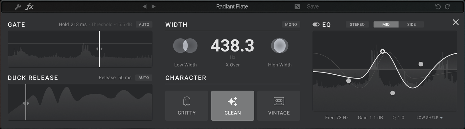 - 4-band Mid/Side EQ sculpts the reverb’s presence and spread, ensuring it fits perfectly into your mix