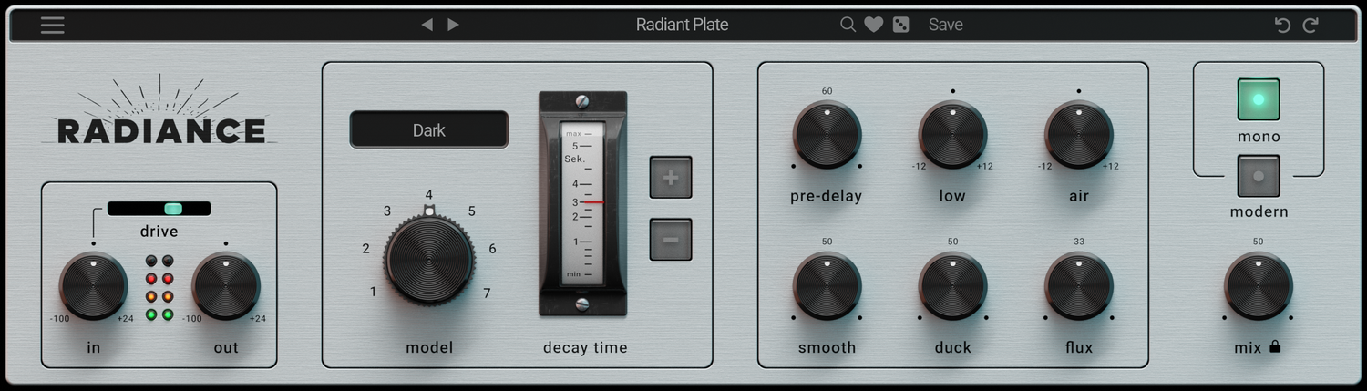 By combining advanced hybrid DSP modeling with powerful shaping and modulation tools, Radiance delivers everything from deep, cinematic vocal tails and tight, rhythmic drum spaces, to shimmering guitar ambiances — all with the lush depth and glowing resonance of true plate reverb.