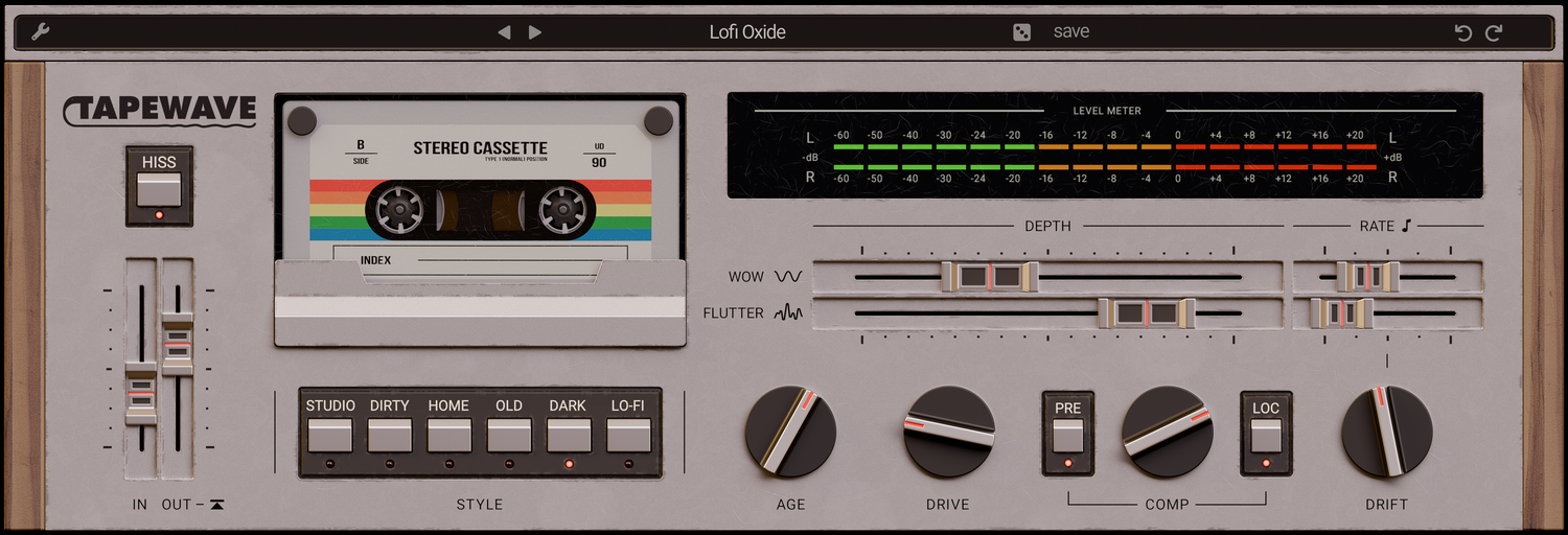 Tapewave is a powerful yet intuitive tape coloration and lo-fi modulation plugin, designed to authentically capture the warmth, character, and unpredictability of cassette tape — while giving you modern control over every detail.