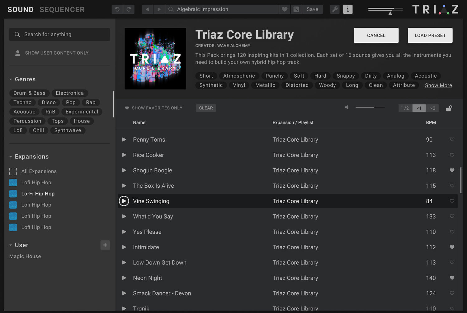 - Mark favorites, preview sounds instantly, and browse Triaz expansions