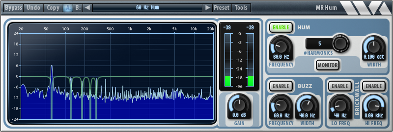 Finally MR Hum also provides brickwall filters to eliminate low or high frequency interference.