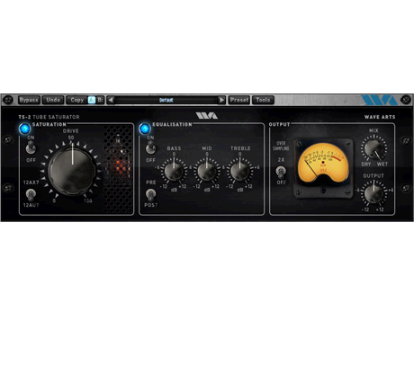 TS-2 has many other features. You can switch between 12AX7 and 12AU7 tubes for different harmonic characteristics. The EQ can be switched to run pre or post saturation. Saturation and EQ are separately switchable. Also there is a 2x oversampling mode using a very high quality resampling algorithm. Use 2x mode to attenuate aliased distortion harmonics. Use the mix control to blend the processed sound with the original. And finally, TS-2 has a gorgeous interface.