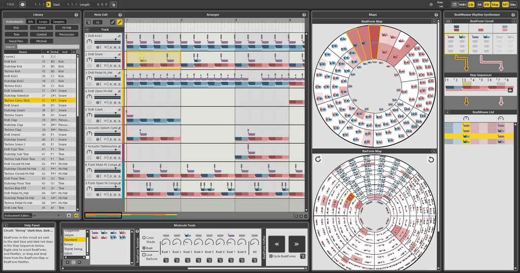 Liquid Rhythm uses an intuitive pattern-based musical language to transform your workflow and let you visualize beats in a whole new way. Use the color-coded Music Molecule structure to help effectively navigate the space of rhythmic possibilities or to selectively target aspects of your beat to vary or complexify.