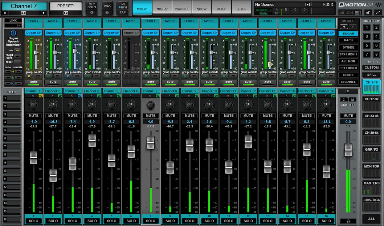 Software version of the Dugan automixer for automatic control of multiple mic gains, designed for integrated use inside the eMotion LV1 live mixing console.