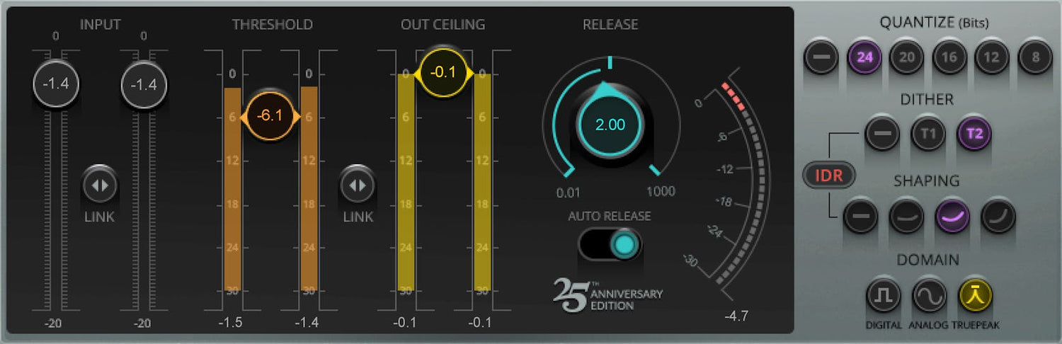 Transparent and punchy, L1 offers true peak limiting that eliminates inter-sample clipping. It maximizes both the?level?of the digital signal and the?resolution of the final file. It offers superb re-quantization for all bit depths. Its look-ahead peak limiter enables you to increase sound file resolution and production master levels with precise control and dithering options.