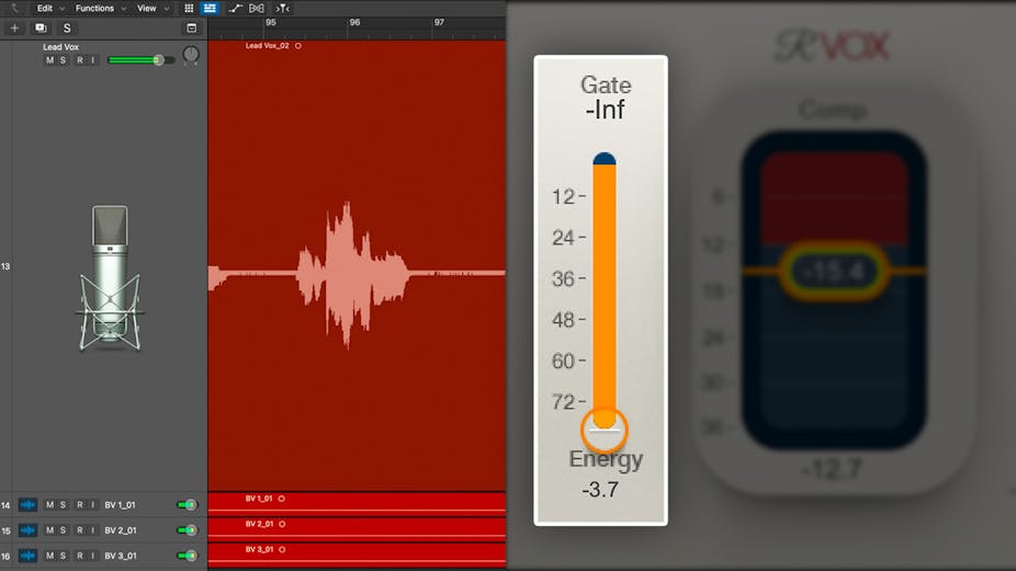 Rather than use a brute-force gate to get rid of noise, R-Vox uses gentle downward expansion. Once R-Vox detects there’s no vocal, the output drops smoothly, but is ready to come back up instantly when needed.