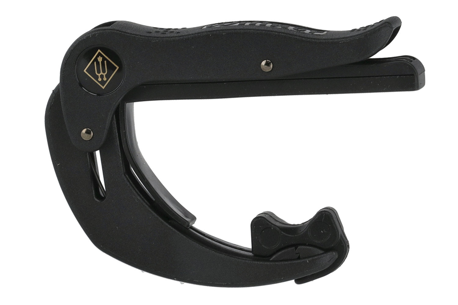 - Press at the pressure point (near the hinge) to lock; press at the pressure point (at the tip of the capo) to open