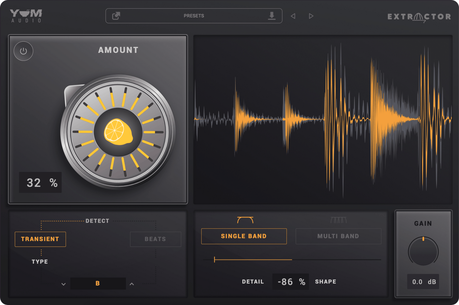 For both modes, choose between Single and Multi Band processing. Use Single Band processing for high and instant transparency. Use the Multi Band option for added intelligent frequency-based processing which extracts the shorter high end while keeping the longer bass frequencies intact.