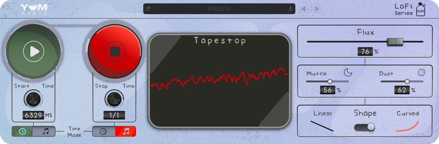 Tapestop uses our virtual tape circuits to replicate the pitch behavior and instabilities an analog tape player produces when starting up or stopping.